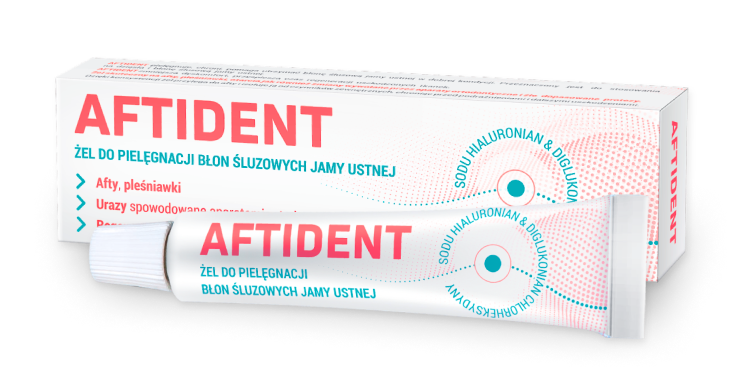 AFTIDENT® jest produktem kosmetycznym przeznaczonym do pielęgnacji błon śluzowych jamy ustnej. Szczególnie zalecany jest w przypadku: aft, pleśniawek, urazów spowodowanych aparatami ortodontycznymi oraz źle dopasowanymi protezami. Żel AFTIDENT® działa kompleksowo na wielu płaszczyznach: pielęgnuje błonę śluzową jamy ustnej, chroni, a także pomaga utrzymać ją w dobrej kondycji. AFTIDENT® zmniejsza dyskomfort i przyspiesza czas regeneracji uszkodzonych tkanek.