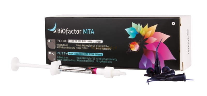 Biofactor MTA Putty to bioceramiczny materiał naprawczy na bazie trój- i dwukrzemianu wapnia (tricalcium/dicalcium silicate), gotowy do natychmiastowego użycia. Nie wymaga mieszania – jest dostarczany w praktycznej strzykawce 1,2 g z aplikatorami, co zapewnia łatwą i precyzyjną aplikację w każdych warunkach klinicznych.