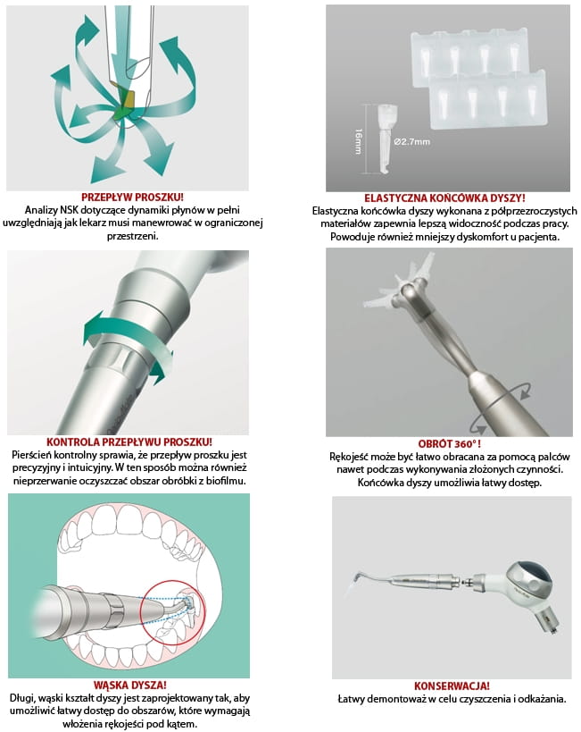 Dzięki wieloletniemu doświadczeniu w analizowaniu dynamiki płynów uzyskiwanemu przy rozwijaniu technologii turbinowej, NSK opracowało bezpieczną i skutecznie działającą metodę natrysku, która umożliwia szybkie, precyzyjne usuwanie biofilmu z zębów.