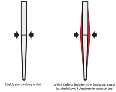 Cadena Endodontic - są to wkłady o wzmocnionej strukturze, środkowa część ma kształt podwójnego stożka (rysunek poniżej). Dzięki temu wkłady te świetnie nadają się do osadzania w kanałach pod różnymi kątami. Rozmiary #1, #2, nadają się szczególnie do zębów z długimi i wąskimi kanałami. Rozmiar #3 nadaje się do zębów z kanałami większymi.